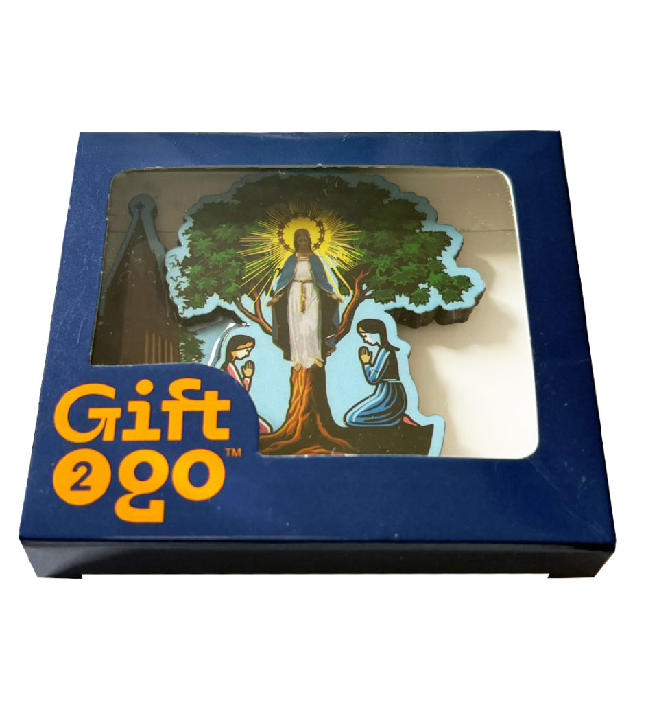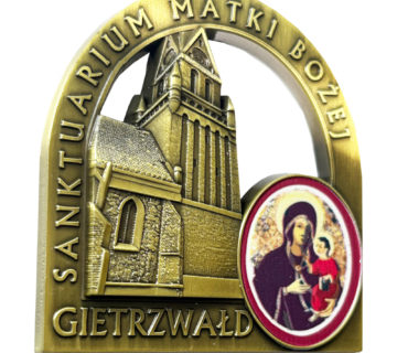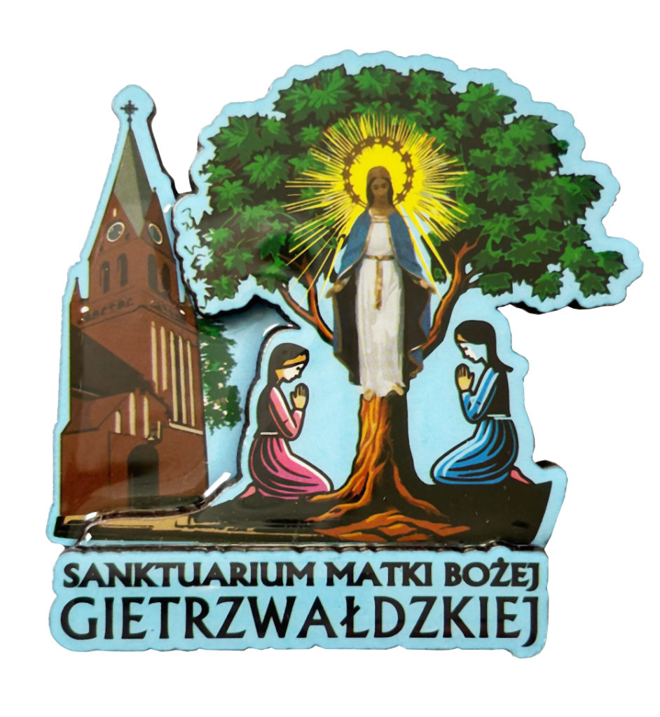 Ten wyjątkowy magnes przedstawia jedno z najważniejszych miejsc kultu maryjnego w Polsce – Sanktuarium Matki Bożej Gietrzwałdzkiej. Na pierwszym planie widzimy wizerunek Maryi ukazującej się dwóm klęczącym dziewczynkom, co nawiązuje do objawień z 1877 roku, uznanych przez Kościół katolicki za autentyczne. Postać Maryi otacza rozświetlona aureola w złocistych barwach, symbolizująca jej boską obecność i opiekę.