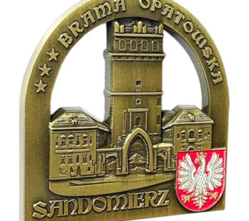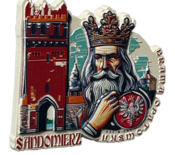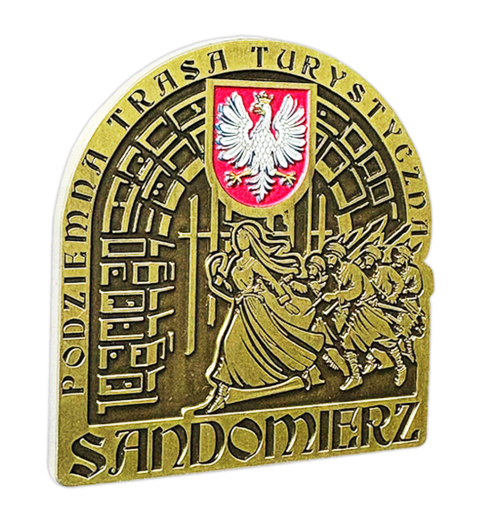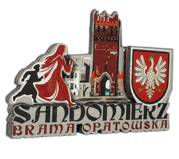Tło przypomina korytarze lochów, a nad wszystkim góruje herb Sandomierza – podkreślający dumę i tożsamość miasta. Całość utrzymana jest w stylu retro z dominacją złota i czerni, co nadaje magnesowi wyjątkowej elegancji i kolekcjonerskiej wartości.