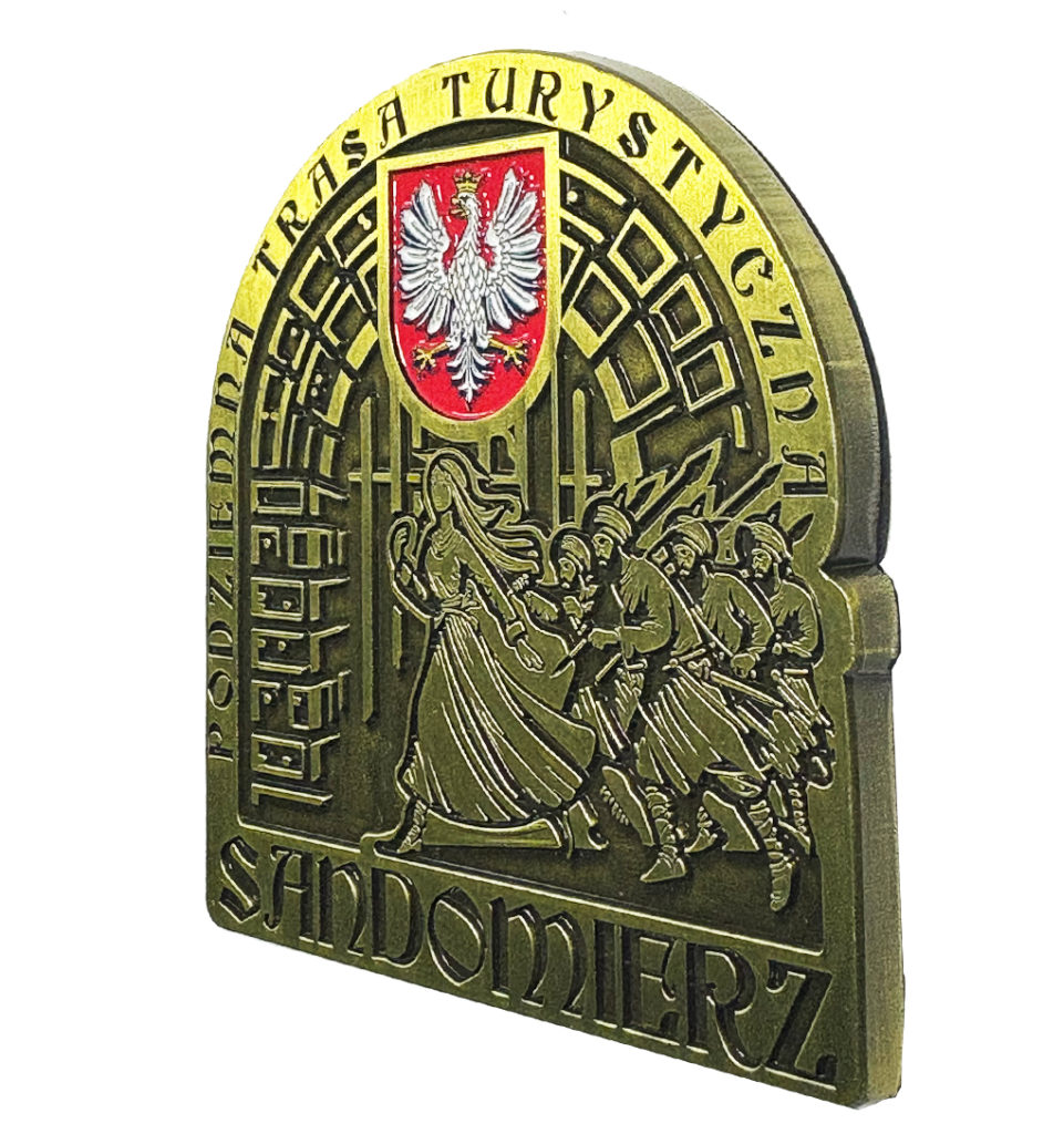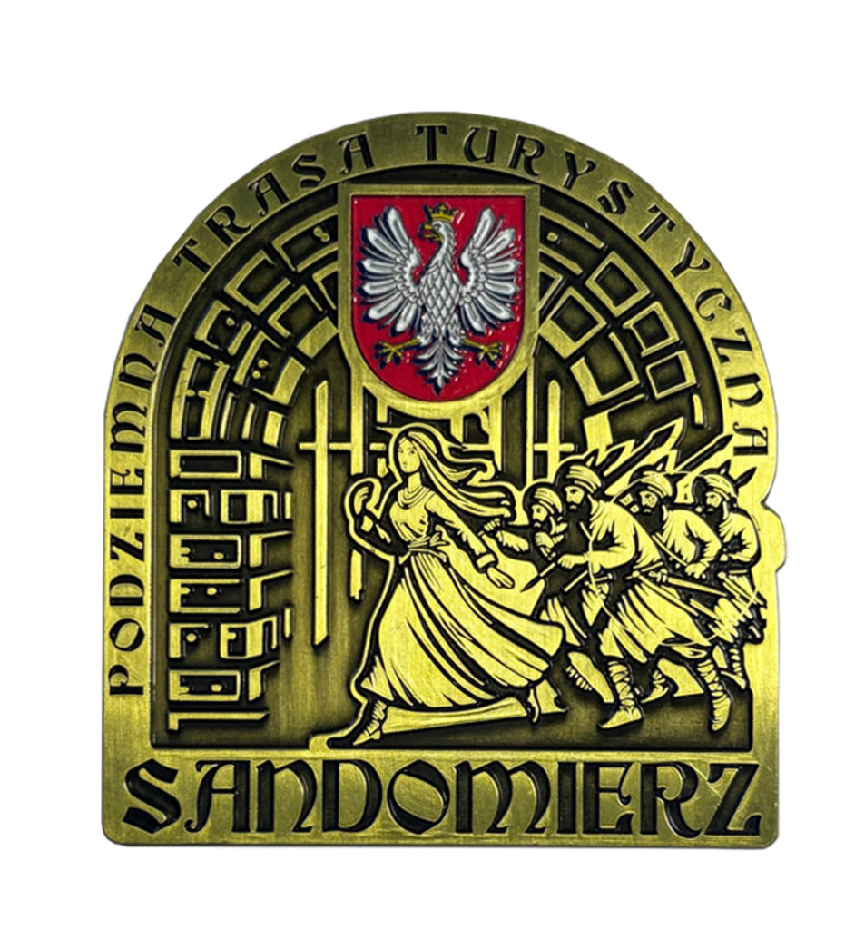 Ten elegancki, złocony magnes prezentuje symboliczną scenę z legendy o Halinie Krępiance – bohaterskiej dziewczynie, która poprowadziła najeźdźców przez sandomierskie podziemia, aby ich uwięzić i ocalić miasto. Centralna postać Haliny ukazana jest w ruchu, z rozwianą suknią, przedzierająca się przez labirynt tuneli. Za nią podążają uzbrojeni wojownicy – zaskoczeni, ale podążający za jej wskazówkami.